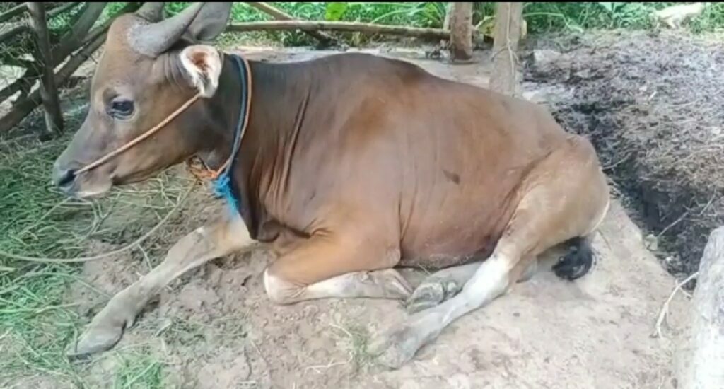 Menurut Marsikun (33), Hewan Sapi miliknya lumpuh sejak jumat siang, saat diketahui sapi miliknya tidak bisa berdiri dan nampak kaki kanan belakang lumpuh.