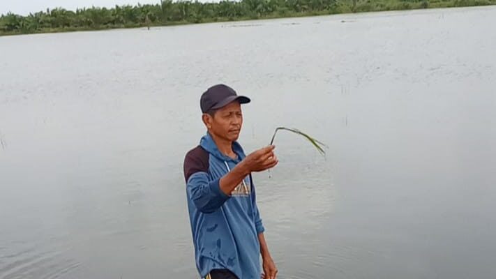 Suparno (48) warga RK. 03 RT. 10 desa Wonosari terlihat cemas dengan kondisi tanaman padinya yang terancam busuk akibat terendam banjir yang cukup lama belum juga surut.