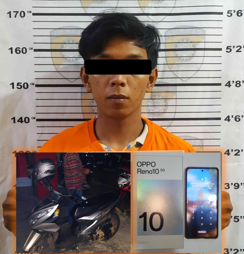 Diketahui pelaku berinisial MK (23), Alamat Gampong Dayah Beureeh Kel. Dayah Beureeh Kecamatan Mutiara Kabupaten Pidie Provinsi Aceh. Dengan barang bukti 1 (satu) lembar Surat Tanda Nomor Kendaraan Bermotor (STNK) motor milik korban, 1 (satu) unit kendaraan bermotor merk HONDA (BeAT Street) warna silver milik korban, 1 (satu) ponsel genggam berikut kotak ponsel merk OPPO Reno10 milik korban.