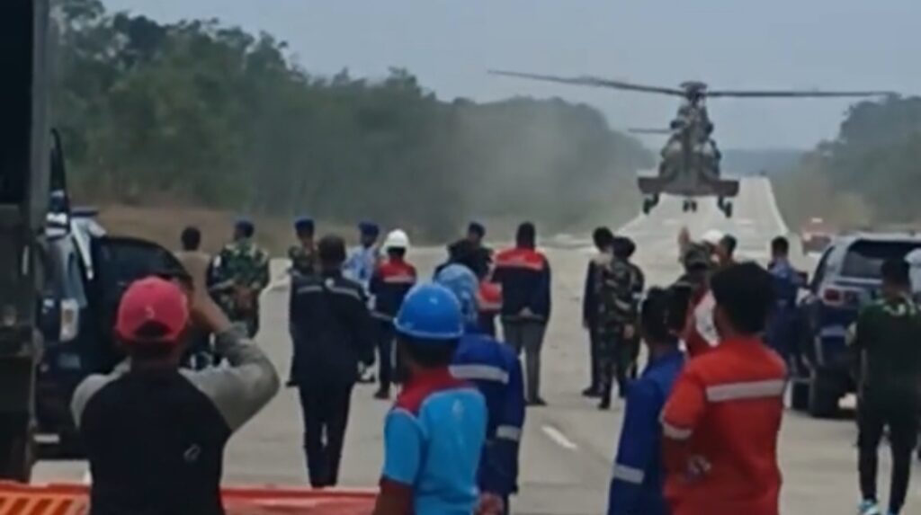 BintangSatu.Com,- Mesuji. Persiapan pelaksanaan uji coba pendaratan darurat pesawat tempur milik angkatan udara di ruas jalan tol trans sumatera Terbanggi Besar dan Pematang Panggang serta Kayu Agung sudah mulai dipersiapan, helly satu persatu mulai didatangkan dilokasi uji coba.